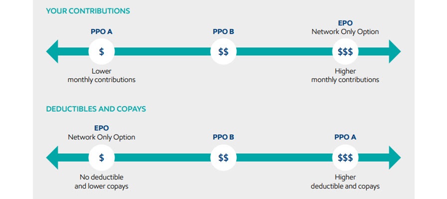 If you prefer to pay less when you need care, consider the EPO option with no deductible and lower copays. Keep in mind, you’ll pay higher contributions out of your paycheck. If you don’t have many health care needs, this option may end up costing you more.